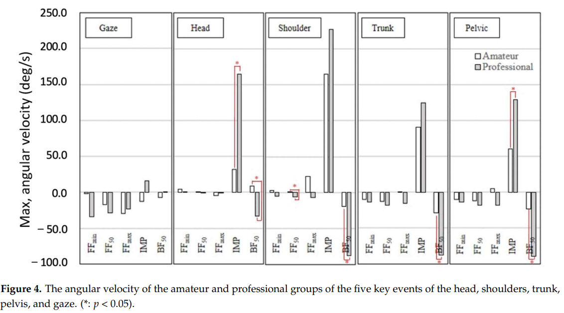 - 시선의 최대 각속도 발생 시점은 다섯 개의 분절(segments) 파라미터 중 가장 이른 시점, 아마추어 그룹 내에서 머리, 어깨, 몸통, 골반의 최대 각속도 발생 시점보다 유의하게 앞서는 것으로 확인됨