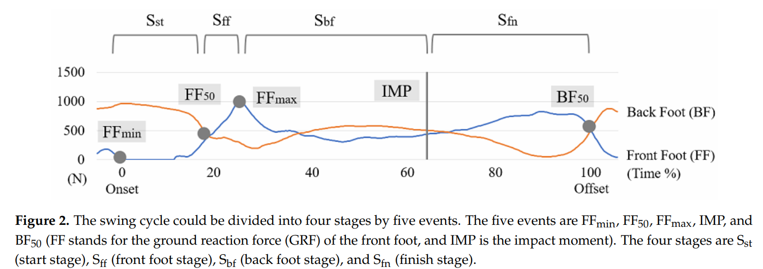Sfn(fn은 finish)으로 정의 - 스윙 주기는 FFmin부터 BF50까지로 정의되었으며, 각 단계의 지속 시간은 전체 스윙 시간 대비 백분율(%) 로 표시되었다.