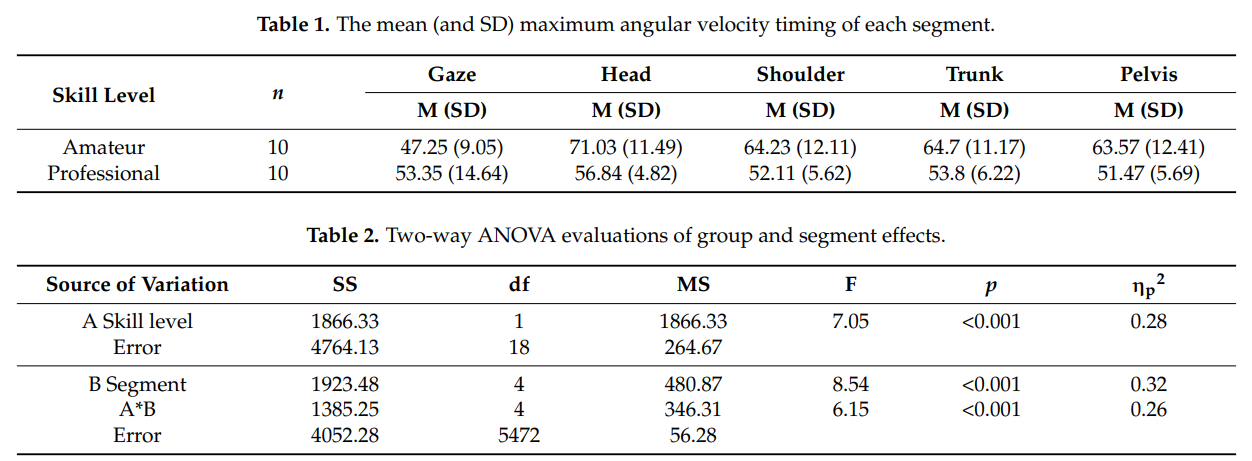 - 스킬 수준 그룹과 타격 이벤트 간의 최대 각속도 발생 시점 차이를 분석하기 위해 이원 분산분석(two factor analysis of variance, ANOVA)이 수행됨