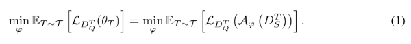 메타 학습의 목표는 새로운 작업을 위해 심층 신경망과 같은 모델을 빠르게 훈련할 수 있는 알고리즘 A를 메타 학습하는 것입니다. 알고리즘 A는 일반적으로 매개 변수화되어 있으며, 매개 변수는 작업 모음을 사용하여 메타 학습 프로세스에서 업데이트됩니다. 메타 학습의 작업 T는 지원 집합 DT S = (xi yi) DT S i=1 및 쿼리 집합 DT Q = (xi yi) DT Q i=1 로 구성되며, 둘 다 레이블이 지정된 데이터 포인트를 포함합니다. 알고리즘 A는 서포트 세트 DT S에 대해 모델 f를 훈련시키고 내부 업데이트라고 하는 파라미터 T를 출력합니다. 그런 다음 모델 fT는 쿼리 세트 DT Q에 대해 평가되고 일부 테스트 손실 LDT Q(T)는 A의 훈련 능력을 반영하도록 계산됩니다. 마지막으로, 테스트 손실을 최소화하기 위해 A가 업데이트되며, 이를 외부 업데이트라고 합니다 지원 및 쿼리 집합은 일반화 가능성을 최대화하기 위해 분리되어 있습니다. 메타 훈련은 에피소드 배치가 작업 분포에서 샘플링되는 메타 훈련 방식입니다. 따라서 알고리즘A는 다음 목표에 따라 최적화됩니다.