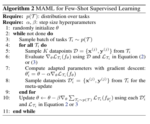 MAML 알고리즘[5]이 대표적인 그래디언트 기반 메타 학습 방법으로, 그래디언트 업데이트 단계를 통해 모델을 훈련합니다. 알고리즘AforMAML은 모델에 대한 초기화를 제공하기 위해 간단히 사용됩니다. 특히, foreachtaskTthealgorithmmaintain = 이는 modelf의 매개 변수의 초기 값을 제공합니다. 그런 다음 지원 세트DT S에 변형되고 훈련 손실이 있는 기울기 단계를 사용하여 T로 업데이트됩니다LDT S ( ):= 1 DT S (xy) DT S (f (x) y), 여기서 손실함수, 예를 들어 이미지 분류 작업에 대한 교차 엔트로피.마지막으로 fT는 쿼리 세트DT QandthetestlossLDT Q ( T):= 1 DT Q (x y) DT Q (fT (x) y)가 계산된다. 방정식(1)의 최적화 목표는 다음과 같이 인스턴스화됩니다. 여기서 는 내부 기울기 업데이트에 대한 학습률입니다.